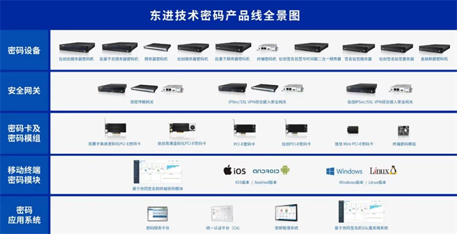 在设备和计算安全维度,东进高速虚拟化PCI-E密码卡、东进终端密码模组等核心硬件产品可深度嵌入服务器、终端设备等计算节点,为设备启动、数据运算提供底层密码支撑,筑牢计算终端的安全根基。